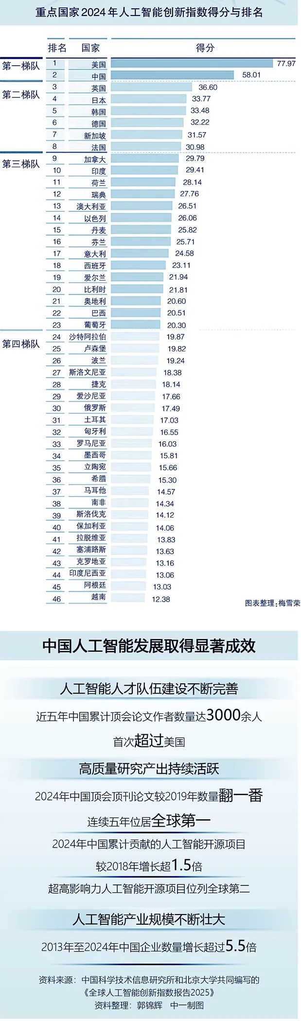 中国科学技术信息研究所和北京大学共同编写的《全球人工智能创新指数报告2025》(以下简称《报告》)对全球人工智能发展趋势形成了四点观察。